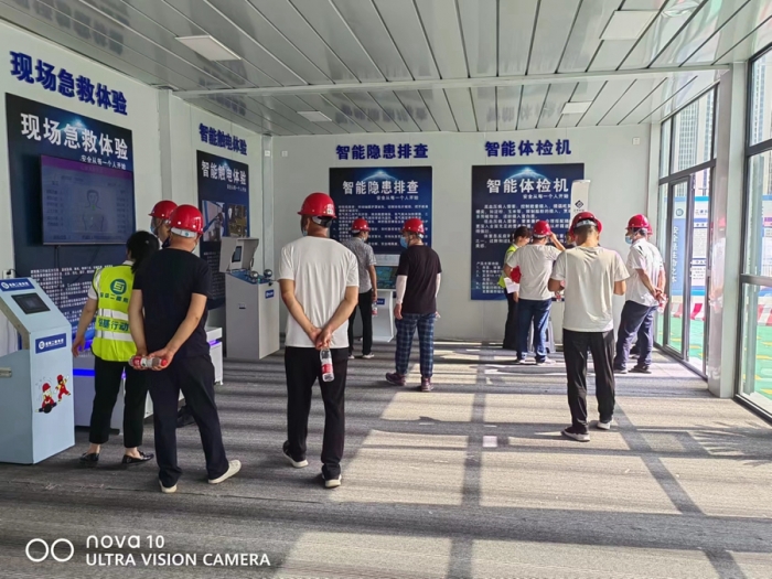 碧桂園鳳凰城三期項(xiàng)目由六棟高層住宅樓、配套商業(yè)及地下車庫組成,總建筑面積為 115340㎡,主體施工采用附著式全鋼爬架+新型鋁合金模板等施工工藝。該項(xiàng)目工序穿插作業(yè)多、群塔作業(yè)等安全管理協(xié)調(diào)難度大,項(xiàng)目積極采用群塔防碰撞系統(tǒng)、塔吊智能監(jiān)測(cè)系統(tǒng)、塔吊防松動(dòng)預(yù)警螺母及塔吊吊鉤可視化系統(tǒng)。觀摩會(huì)現(xiàn)場(chǎng)中,通過智慧工地云平臺(tái)、安全管理指揮中心、VR安全教育體驗(yàn)館等全面展示了項(xiàng)目施工現(xiàn)場(chǎng)智慧工地和文明施工管理現(xiàn)代化模式。